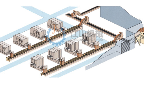 集中輸送裝置は、1つの作業(yè)場(chǎng)に1本の主搬送裝置といくつかの支線輸送裝置を設(shè)置する。工作機(jī)械によって発生した切屑は、支線輸送裝置から主搬送裝置に搬送され、さらに主搬送裝置が切屑集中処理所に搬送される。